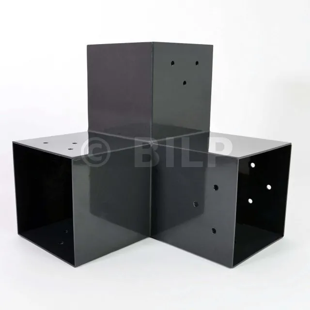 Es wird in einer Außenecke verwendet. Mit diesem Verbinder können Sie einen großen 120 x 120 mm großen Balken senkrecht mit einem 120 x 120 mm großen Balken verbinden, wobei das Ganze von einem 120 x 120 mm großen vertikalen Pfosten getragen wird.
