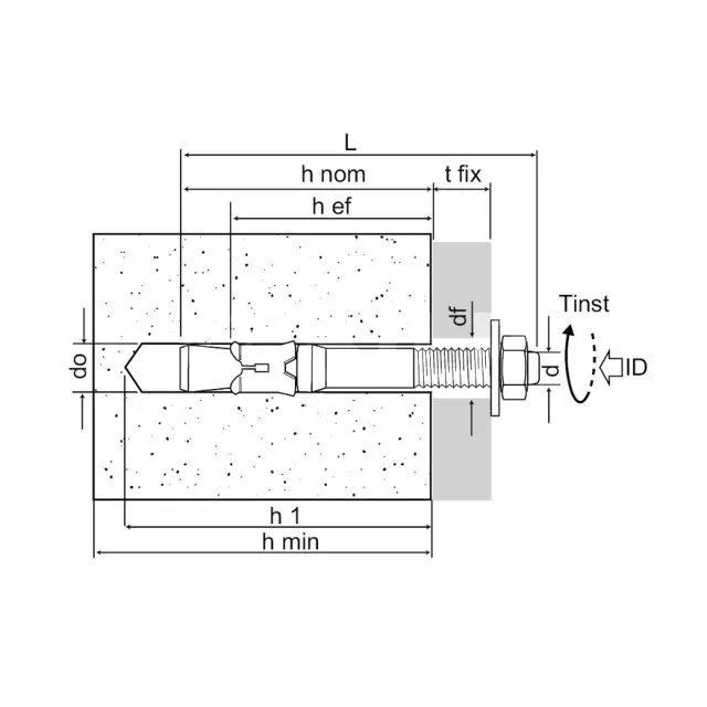 | Referenzen | Produktreferenz | Abmessungen [ØxL] [mm] | Bohr-Ø [d0] [mm] | Prof. min. Bohrtiefe [h1] [mm] | Ø Bohrung im zu befestigenden Teil (durchgehend) [df] [mm] | Schlüsselweite an der Fläche [SW] [mm] | Anziehen Drehmoment [Tinst] [Nm] | Prof. Verankerung [hef] [mm | Ep. Mindestauflage [hmin] [mm] |