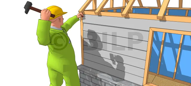 Außer durch Zufall oder wenn Sie im Voraus richtig gerechnet haben, muss der obere Teil der letzten Reihe der Verkleidung angepasst werden. Schneiden Sie mit einer Kreissäge und einer Linealführung die Oberseite der Leiste so ab, dass die Schnittebenen gut an der Zierleiste anliegen. Nageln Sie die zugeschnittenen Bretter an Ort und Stelle fest.