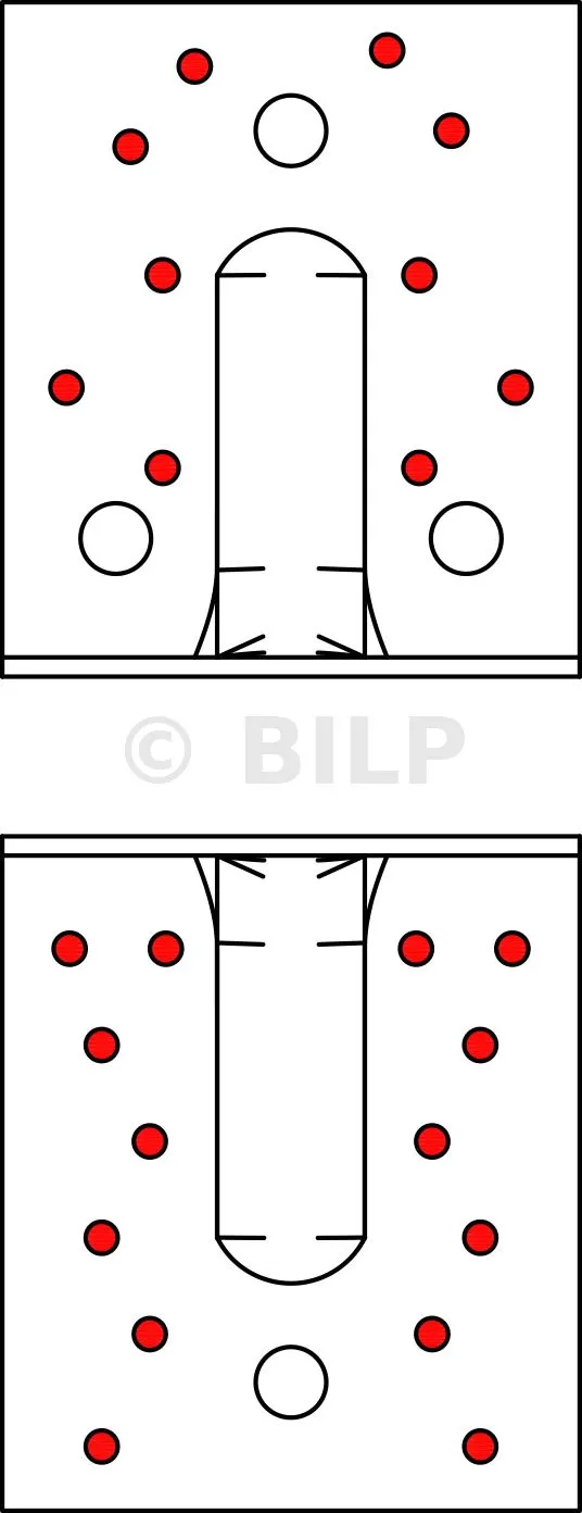 | Referenzen | Abmessungen [mm] | Bohrungen Flügel A | Bohrungen Flügel B | |||||