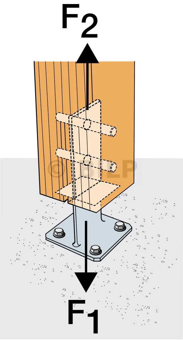 - Holzverbindung auf starrem TrägerSur poteau : 2 STD12 ; sur béton : 4Ø10 (goujons WA M10 ; tige filetée M10) ; sur acier : boulons