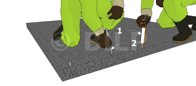 - 1 : Injizieren Sie das Harz in die Bohrung. Bis zur Hälfte der Tiefe auffüllen.