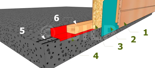 Der Dichtungsbahn der Wand sollte nach unten ragen, vor der Nase der Platte und des zuvor gefalteten Bitumenbandes vorbeilaufen und einige Zentimeter entlang der Betonplatte nach unten verlaufen, ohne den Boden zu berühren. Die Verkleidung wird dann mindestens 3 cm von der Schwelle nach unten gehen.