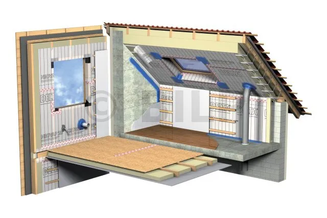 - Luftdichtheitsschicht unter isolierten Schrägen (traditionelle oder Holzrahmenkonstruktionen)