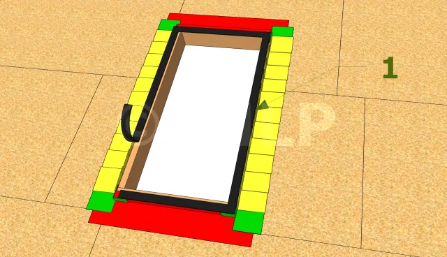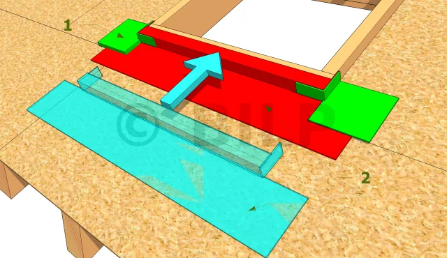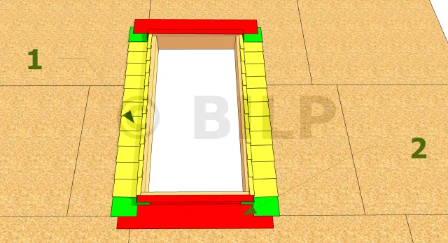 - 2 : Außenabdichtung : untere Elemente. Dieser Teil wird aus einem breiten Bitumenbahn geschnitten.