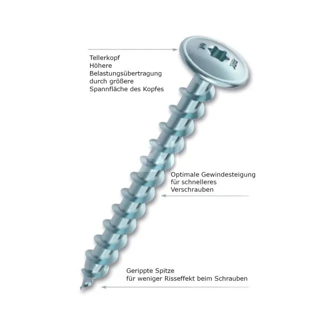 - Breiter Rundkopf mit zusätzlicher Dicke unter dem Kopf; bessere Zentrierung der Holzverbindung und Befestigung ohne Beschädigung des Metallträgers