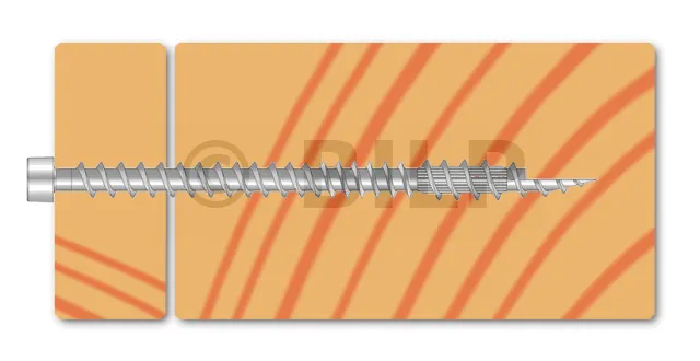 - Eine Schraube, deren Achse im Falle von ESCR(XXX) 45 bis 90° von der Maserung des Holzes entfernt ist, und 90° von der Maserung des Holzes bei anderen Schrauben.