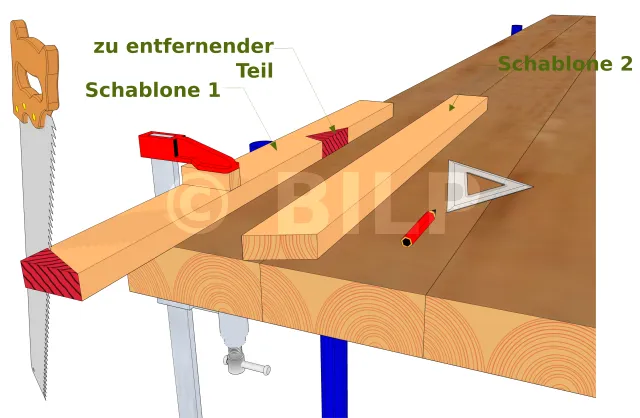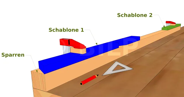 Dies muss mit größter Sorgfalt geschehen, da dieser erste Sparren als Referenz dienen wird. Zeichnen Sie mit einem Winkelmesser, einem Messlineal und Ihren Plänen in der Hand die Kantenlinie schräg an einem Ende des Brettes und markieren Sie den zu entfernenden Teil mit einem Bleistift. Markieren Sie dann die Ebenheit, ihre Position und die Maße. Markieren Sie die zu entfernenden Teile mit einem Bleistift. Entfernen Sie dann diese Teile mit einer Säge. Ihre Schablone sind fertig.