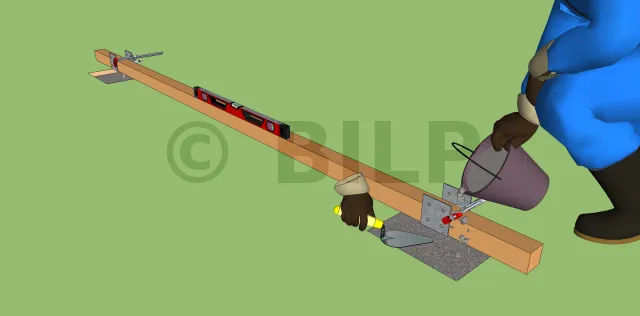 Fügen Sie dazu während des Versiegelns 4 cm dicke Holzbrettchen hinzu, um den Pfostenträger auf dieser Höhe zu halten. Die Bretter werden auf dem Boden liegen.