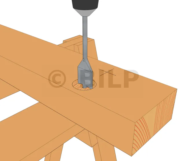 Wenn Sie möchten, dass die Befestigungselemente vollständig freiliegen, d.h. bündig mit der Oberfläche der Träger abschließen, überspringen Sie diesen Schritt. Der Grund dafür ist, dass das Sackloch verwendet wird, um die Unterlegscheibe und die Mutter im Holz zu verstecken. Es verbessert das ästhetische Erscheinungsbild erheblich.