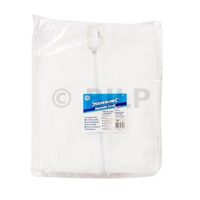 Weißer Einweg-Overall aus Polypropylen. Reißverschluss vorne sowie Kapuze, Arm- und Beinabschlüsse mit Gummizug. Leicht und atmungsaktiv. Für staubige Umgebung, wie z. B. bei Renovier- und Wartungsarbeiten ideal.