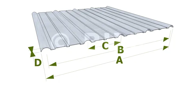 Die Standardbreite von galvanisierten / verzinkten gewölbten Dachbleche beträgt oft entweder 81 cm oder 96,52 cm (wie in dieser Abbildung gezeigt). Bei letzterem deckt er bei der Verlegung eine Fläche von 92 cm ab, da sich die seitlichen Enden überlappen müssen. Die Wellungen von 1,91 cm werden in Abständen von 22,86 cm angetroffen. Die Standardlänge beträgt 2,40 m, aber jede Länge kann jederzeit bestellt werden.