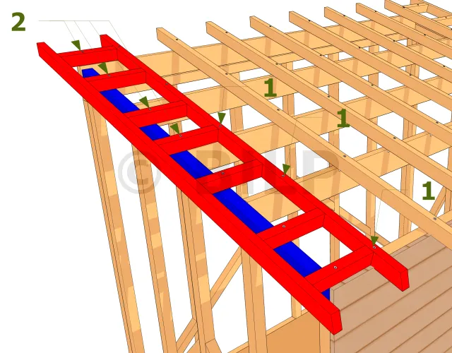 Der Innensparren ruht und ist (1) an den Pfetten befestigt. Die Abstandhalter werden (2) an der schrägen Schiene der Wand befestigt (in blau).