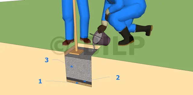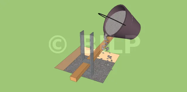 Fügen Sie dazu während des Versiegelns 4 cm dicke Holzbrettchen hinzu, um den Pfostenträger auf dieser Höhe zu halten. Die Bretter werden auf dem Boden liegen.