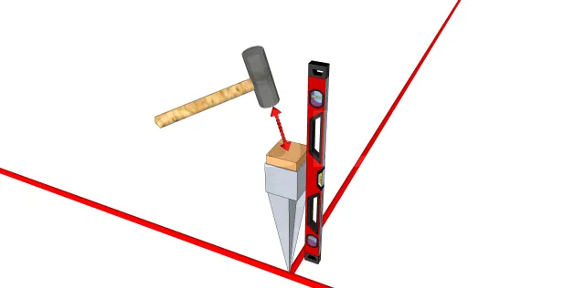 - Schlagen Sie mit einem Vorschlaghammer weiter, bis der Anker vollständig versenkt ist (die Platte muss bündig mit dem Boden abschließen). Kontrollieren Sie die Vertikalität und die Ausrichtung des Fußes (mit dem Lot) während des Gehens, da es schwierig sein wird, den Fuß nach dem Eintreiben in den Boden zu korrigieren.