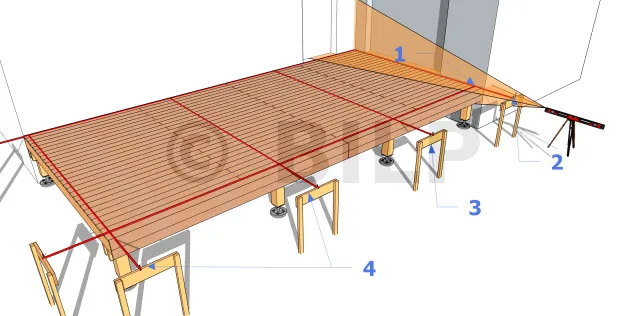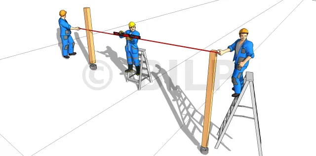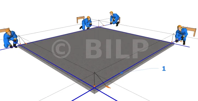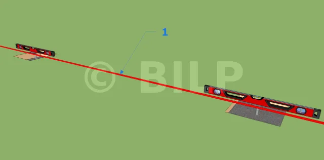 - 2 : Stellen Sie ein Schnurgerüst auf die gegenüberliegende Seite (Vorderseite) mit einem Markierungspunkt, der parallel zum ersten vorhergehenden Punkt liegt. Verwenden Sie dazu eine Laserwaage. Das Schnurgerüst muss sich auf derselben Höhe wie der Bodenbelag befinden.