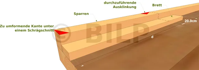 Die Fußpfette wird durch eine Fußpfette ergänzt, deren Oberseite die gleiche Neigung wie das Dach hat. Diese Fußpfette ist mit Sechskant-Holzschrauben an der Pfette befestigt. Der Sparren ist mit einer Kerbe senkrecht zur Fußpfette versehen. Er wird dann an der Schraube oder dem Nagel an dieser Fußpfette befestigt.