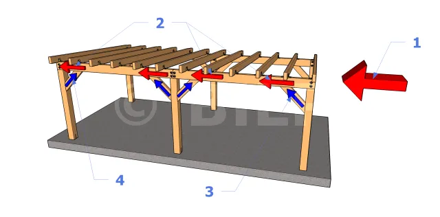 Der Wind verursacht eine horizontale Kraft (in rot) auf die Struktur. Da der Widerstand der Befestigungspunkte im Vergleich zu dieser Kraft vernachlässigbar gering ist, sind die Befestigungen ähnlich wie Gelenke (in blau). Die Struktur kippt um diese Gelenke herum.