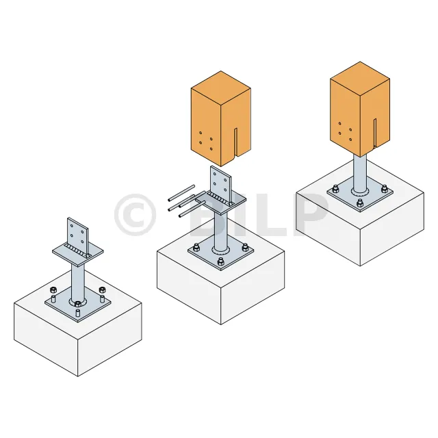 * Beziehen Sie sich auf das Simpson Strong-Tie Verankerungssortiment, um die passende Verankerung auszuwählen. Standardlösungen sind BOAXII, SET-XP, WA, AT-HP, die je nach Betonart, Achsabstand und Randabständen ausgewählt werden.