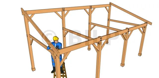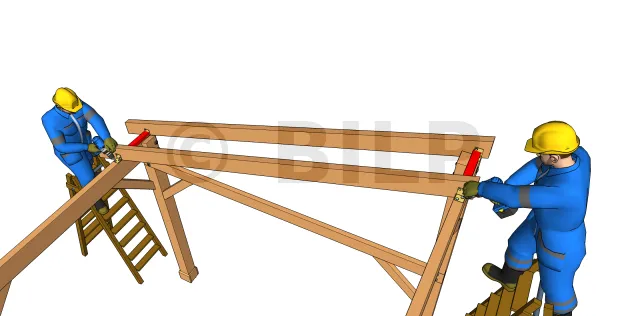 Befestigen Sie die beiden Sparren an den Enden. Befestigen Sie die Sparren mit einer Technik, die an die Parameter der Struktur und des Elements angepasst ist (Größe, Position, Kraft, Belastung). Diese Wahl ist während der Entwurfsphase der Struktur zu treffen und muss auf den Zeichnungen angegeben werden.
