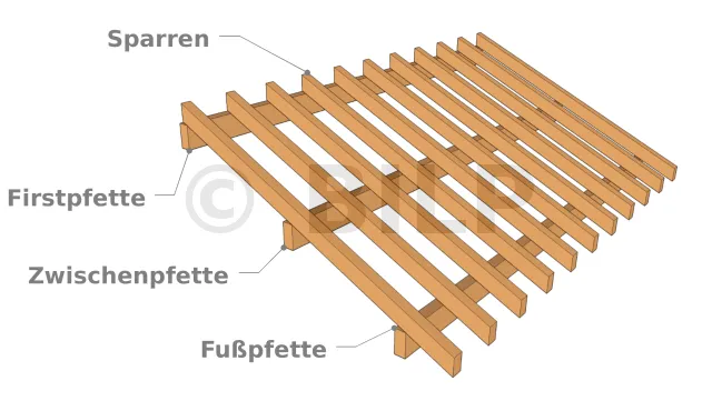 - Die Zwischen- oder Mittelpfetten befinden sich zwischen der Firstpfette und der Fußpfette. Sie entlasten die Sparren zwischen der Teilung ihrer Spannweite.
