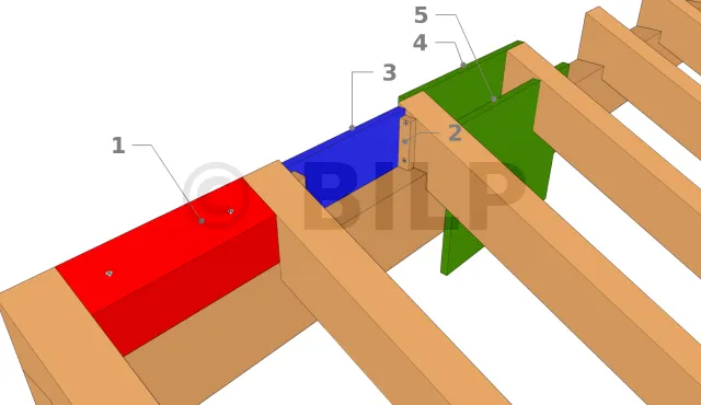 - In blau : die Latten (2) sind gegen die Dachsparren befestigt. Dann wird ein Brett gegen die Latten befestigt. Diese Methode kann später im Bauprozess angewendet werden, aber sie bietet keine sehr gute Abdichtung und es ist nicht einfach, die Latten korrekt zu befestigen.