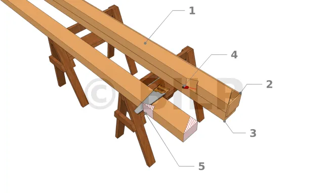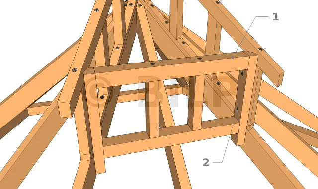Zusammenbau und Befestigung der Querbalken und Abstandhalter, die die Stufe außerhalb des Dachstuhls bilden
