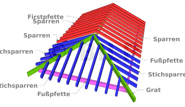 Die Sparren (in rot) decken den Abstand zwischen der Firstpfette (in gelb) und der Fußpfetten (in rosa). Die Grate (in grün) sind mit der Firstpfette in einem Winkel verbunden, in dem die beiden Ebenen des Daches aufeinander treffen. Die Stichpfetten (in blau) sind geschnittene Sparren, die von der Grate bis zum Fusspfette verlaufen.