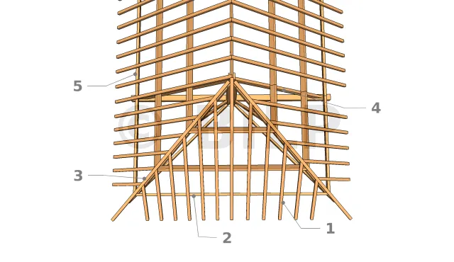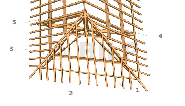 Bei diesem schrägen Walm liegt der Binder senkrecht zur Fußpfette, die in Richtung der Langfläche des Bauwerks verlegt wird, während der Walm-Halbinder und die Stic[...]