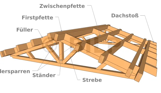 Die drei Hauptelemente, aus denen ein Dachbinder besteht, sind : der Bindersparren, der Binderbalken und der Ständer.