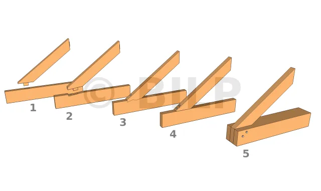 Um ein Dachbinder mit einem einzigen Querbalken zusammenzubauen, werden die Bindersparren, Verstrebungen und Ständer mit traditionellen oder modernen Techniken AM Querbalken befestigt.