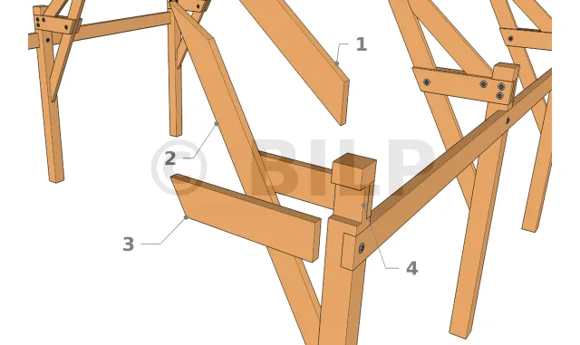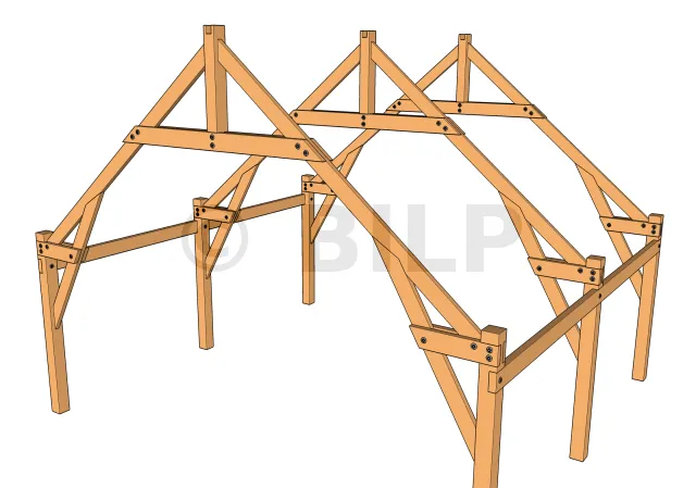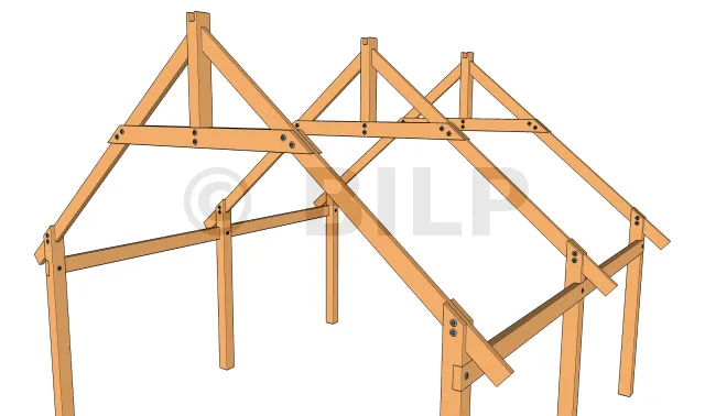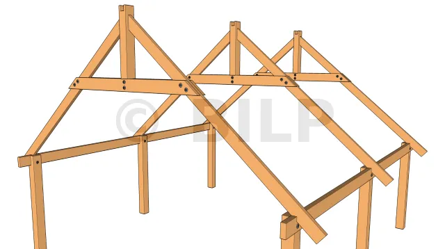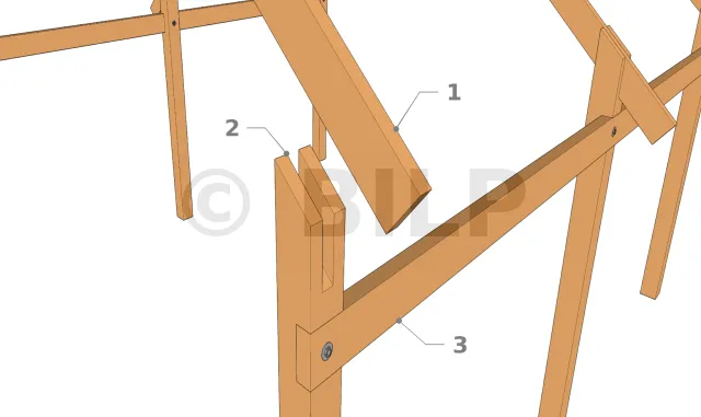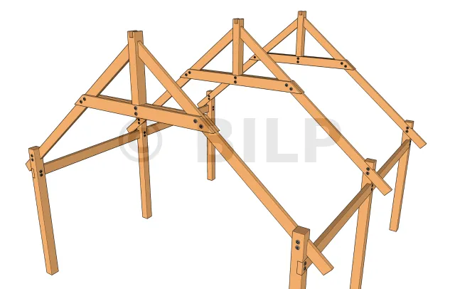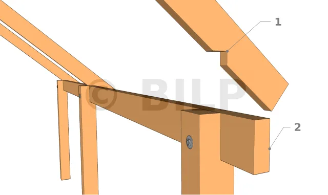 Die Bindersparren werden entweder durch Verschraubung oder durch Holzdübel an den Pfosten befestigt. Diese Zubehörteile müssen so ausgelegt sein, dass sie den abzustützenden Scherkräften standhalten.