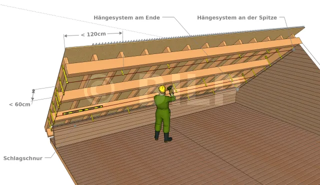 Ihr Abstand sollte sich nach der Struktur Ihres Dachbinders richten, aber es ist wichtig zu wissen, dass der maximale Abstand in vertikaler Richtung 60 cm und in horizontaler Richtung 120 cm beträgt.