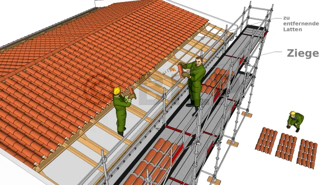 Sie müssen die Ziegel von dem bestehenden Dach am unteren Ende des Abdachs entfernen und für einige Reihen, je nach Dach, beiseite legen. Diese können weiterhin verwendet werden, wenn Sie das neue Dach abdecken möchten. Wenn die Neigung Ihres Daches relativ gering ist, müssen Sie auch die Dachlatten entfernen, indem Sie sie herausschneiden.