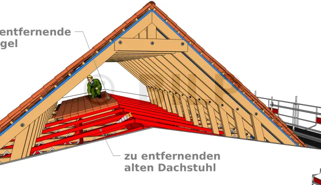 Wenn die Dachneigung nicht ausreicht, d.h. weniger als 30% beträgt, kann sie auf einer oder zwei Seiten korrigiert werden, um mehr Platz freizugeben. Dazu muss die alte Dachkonstruktion mit einer zu geringen Neigung durch eine neue ersetzt werden, die steiler ist oder Winkel bilden kann.