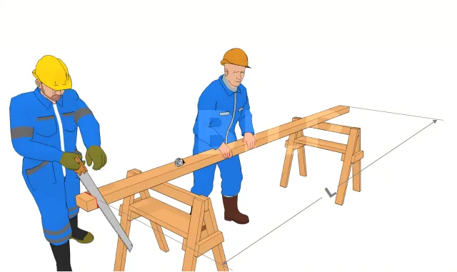 Dieser erste Schritt sollte für jeden Holzarbeiter ein Reflex sein. Man nimmt das Quadrat auf einer Seite des Balkens und sägt es mit einer Kreissäge oder einer Handsäge ab. Wenn nach Überprüfung der gekauften Pfette das Ende bereits rechtwinklig ist, kann dieser Schritt übersprungen werden.