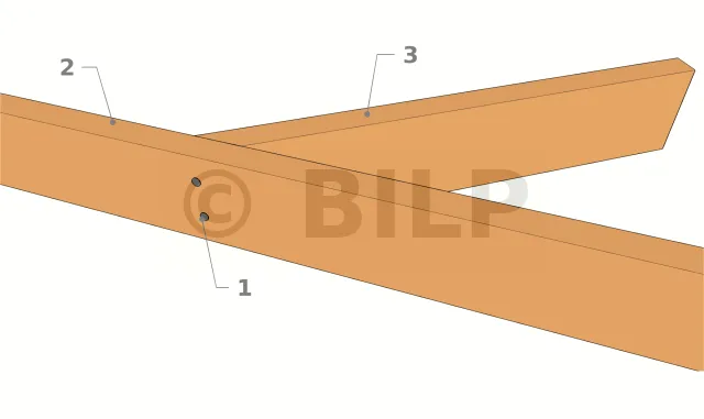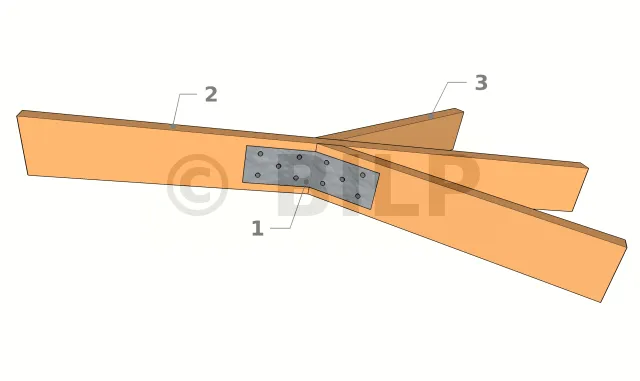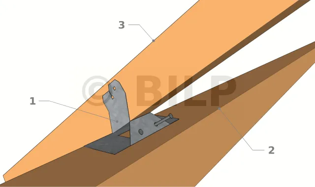 Zubehörteil zur Befestigung des Dachsparrens über einer Pfette. Dieses Zubehör wird für einen Pultdachstuhl verwendet, da es schwierig wäre, zwei gegenüberliegende Sparren auf derselben Linie zu befestigen, außer bei versetzten Sparren.