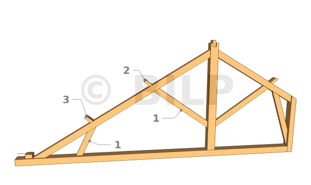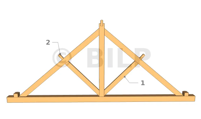Im Falle eines abgestumpften Dachbinders mit einem sehr langen Bindersparrens, die zwei Mittelpfetten trägt, wird die Strebe an einem Ende auf dem Querbalken und am anderen Ende unter dem Bindersparrens auf Höhe der zweiten Mittelpfette positioniert.