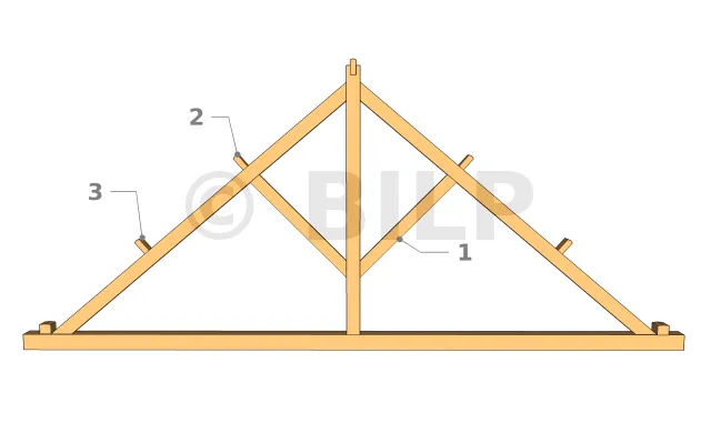 Wenn der Bindersparren zwei Mittelpfetten unterstützt, wird die Strebe unter dem ersten Pfette positioniert, d.h. die Pfette, die auf den Ständer folgt. Im Gegensatz zum vorherigen Fall wird in diesem Fall eines der Enden der Strebe nicht auf der Höhe des unteren Teils des Ständers liegen, sondern etwas höher.