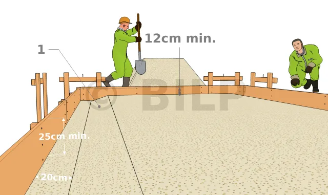 ermöglicht es, eine stabilisierte und drainierende Stütze vorzubereiten. Die Kanten sind tiefer, weil sie den Band bilden. Wenn Sie für die Ausgrabung einen Bagger gemietet hatten, reservieren Sie einen zusätzlichen Tag für die Ablagerung des Kieses, da dieser mehrere Kubikmeter betragen kann. In jedem Fall wird die Neigung der Kanten mit einer Schaufel gebildet. Überprüfen Sie die auf dem Diagramm angegebenen Mindesthöhen. Hierbei handelt es sich um Höhenangaben in Bezug auf die Oberseite der Schalung. Der Wert des Neigungswinkels ist nicht wichtig.