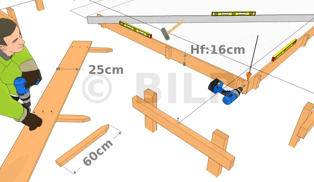 Bei lehmigem oder sandigem Boden oder bei strengen Wintern empfiehlt sich beim Bau einer offenen Struktur (Pergola, Terrasse, Carport, Überdachung, Gloriette usw.) die Verwendung von Betonfundamentstein (siehe) und im Falle einer Hütte ein Streifenfundament (siehe), die das Sitzen unterhalb der Frostgrenze ermöglicht.