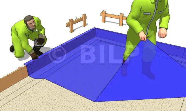 Die Dampfsperrfolie dient dazu, das Aufsteigen von Feuchtigkeit in die Platte zu verhindern. Es handelt sich um eine Polyan-Folie. Die Mindestdicke beträgt 150 Mikrometer. Darunter kann die Folie vor dem Gießen des Betons leicht durchstochen werden. Die speziell für Fundamente verkauften Rollen betragen mehrere Dutzend m², was für eine kleine Konstruktion zu viel sein kann. Sie können sie dann durch eine einfache "kostengünstige" Ösenplane ersetzen. Heften Sie die Folie an die oberen Felder der Schalungstafeln. Wenn Sie die Verstärkung nicht sofort positionieren, denken Sie daran, den Film in der Zwischenzeit mit ein paar Brettern zu beschweren. Eine starke Windböe könnte einigen Schaden anrichten. Diese Folie ist optional auf einem Boden ohne Risiko aufsteigender Feuchtigkeit. Aber vorsichtshalber ist es notwendig, einige zu setzen, es kostet nicht viel.
