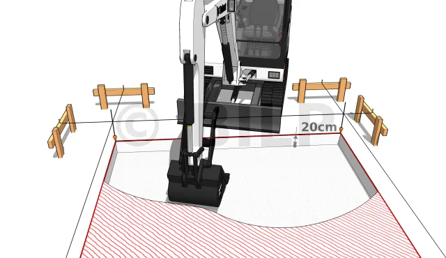 Bei kleinen Flächen von weniger als 10 m² können Sie mit Spaten und Spitzhacke graben, aber die Anmietung eines kleinen Baggers spart vor allem bei großen Flächen Mühe und Lendenwirbelstütze. Stellen Sie einen Platz zur Verfügung, um das Aushubmaterial zu lagern oder es gleichmäßig auf dem Boden zu verteilen, falls der Rasen später neu angelegt werden muss. Die Ausgrabung kann einige Zentimeter nach außen ragen, da die Formen eine gewisse Dicke haben. Graben Sie bis zu einer Tiefe von etwa 20 cm. Die Schnüre können bei dieser Aufgabe entfernt werden, vorausgesetzt, dass der Umfang der Platte ordnungsgemäß auf den Boden übertragen wurde, z.B. durch Nachziehen mit einer Schaufel.