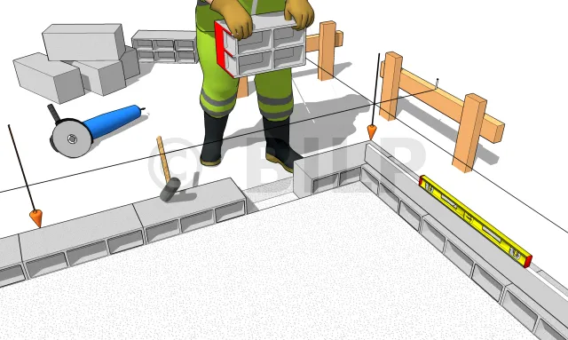 Drücken Sie jedes Betonblockstein mit dem Vorschlaghammer fest in den Boden des Grabens. Die Betonblocksteine liegen auf ihrer Seite, wobei die Zellen zur Innenseite der Platte zeigen. Überprüfen Sie die Ausrichtung der Betonblocksteine auf dem Referenzdraht. Überprüfen Sie die Ausrichtung der Betonblocksteine mit dem Lineal des Maurers. Überprüfen Sie die Horizontalebene mit der Wasserwaage.
