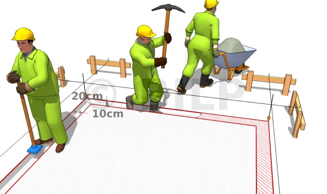 auf einer Tiefe von etwa 10 cm und einer Breite von 20 cm (Höhe eines Betonblocksteins). Dieser Graben wird als Wiege für die Betonblocksteine dienen. Der Spaten ist das ideale Werkzeug und die Spitzhacke wird in schwierigem Gelände eingesetzt.