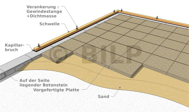 Die Schwelle wird dann an der Außenkante der Betonsteine befestigt. Es wird die Technik der c[...]