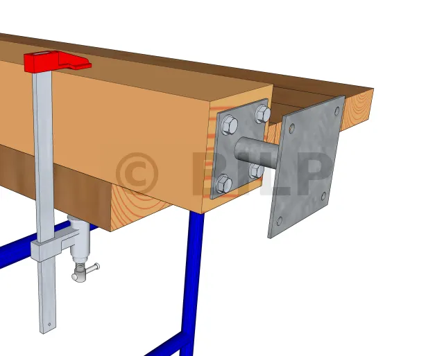 Für den zweiten Fall der Befestigungsschraube befestigen Sie dann den Pfosten mit Sechskant-Holzschrauben am Pfostenträger und halten Sie die Baugruppe mit Leisten fest.