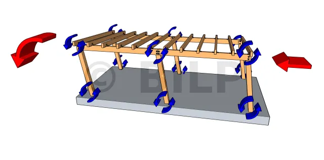 Der Wind verursacht eine horizontale Kraft (in rot) auf die Struktur. Da der Widerstand der Befestigungspunkte im Vergleich zu dieser Kraft vernachlässigbar gering ist, sind die Befestigungen ähnlich wie Gelenke (in blau). Die Struktur kippt um diese Gelenke herum.