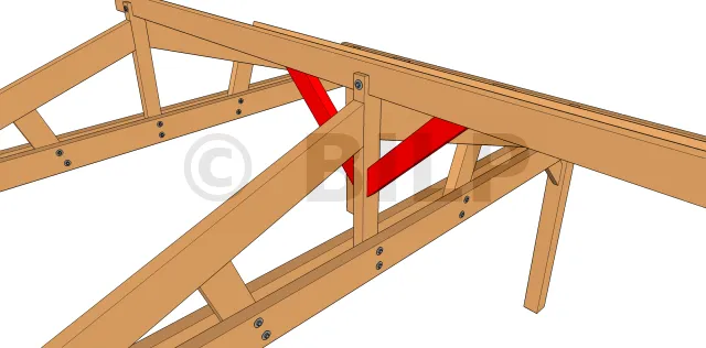 In der Tiefe der Arbeit fällt man oft zwischen einen Pfosten, der sich nicht rechts von einem Sparren befindet. Es ist daher in diesem Fall nicht möglich, die Strebe zu befestigen. Es ist möglich, einen Abstandhalter herzustellen, die an den beiden benachbarten Sparren befestigt wird, und dann die Strebe zwischen derm Pfosten und dem Abstandhalter zu befestigen. Die Strebe muss zu ihrer Kraftverteilung in die Mitte des Abstandhalters fallen.