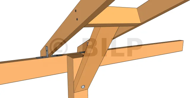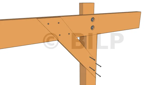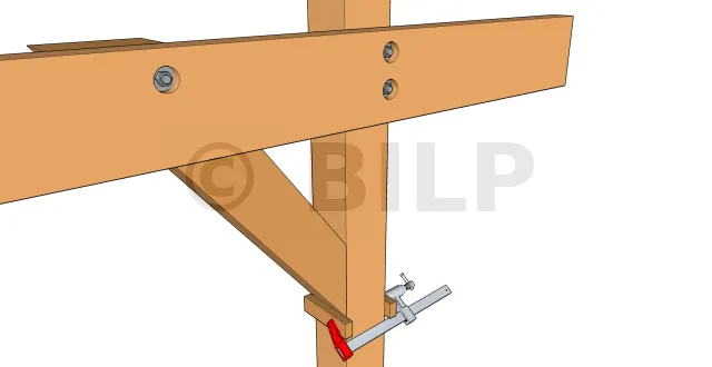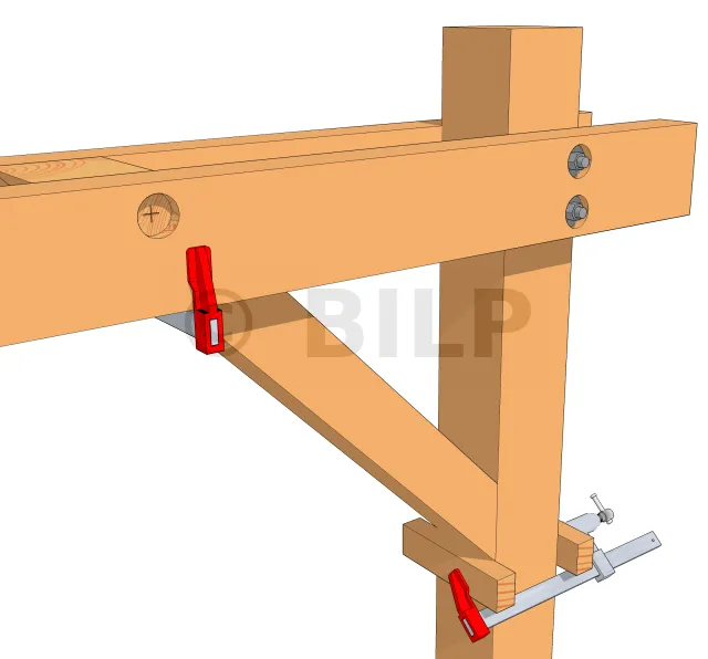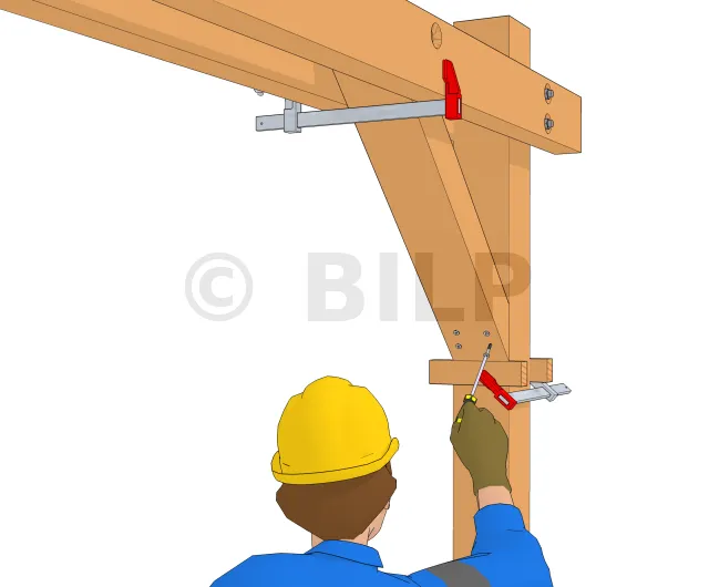 - 1: Positionieren Sie den Arm, indem Sie das obere Ende des Armes mit der Oberkante der Pfetten ausrichten. Bringen Sie eine erste Schraubzwinge unter dem Arm am Pfosten an, um ihn in Position zu halten. Kleine Stollen auf beiden Seiten erleichtern die Ausrichtung. Wenn der obere Teil des Arms nicht auf die Pfetten ausgerichtet ist, richten Sie einfach den unteren Teil des Arms auf den Pfosten aus.